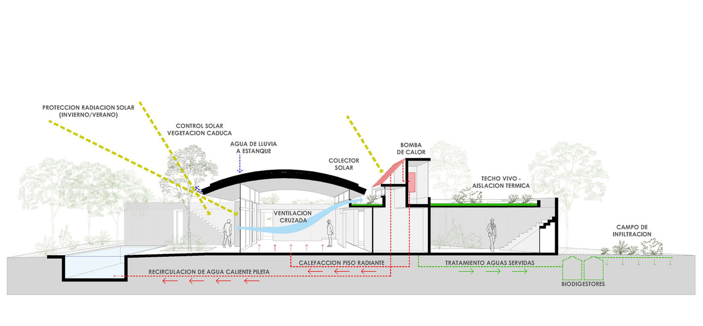 La casa se plantea como un regrueso del suelo, una breve elevación horizontal maciza y extendida que reponga el suelo ocupado en una terraza viva, como un modesto homenaje a dos de los infinitos, la pampa y cielo, así la terraza crea un espacio y un tiempo de cercanía y coexistencia con ambos, a la vez que promueve el desarrollo de ecosistemas que armonizan los insectos, las plantas nativas y las aves.